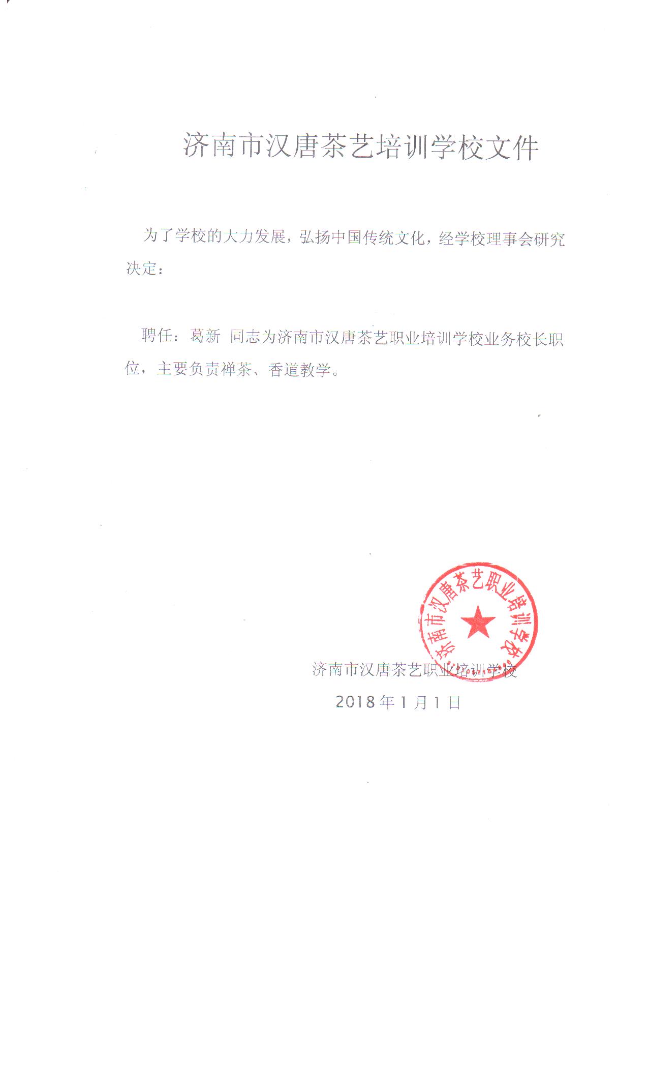 聘任:葛新同志为济南市汉唐茶艺职业培训学校业务校长职位,主要负责禅茶、香道教学。