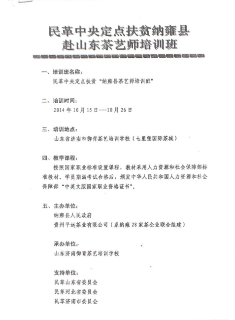 2014年10月15日,民革中央定点扶贫纳雍县山东茶艺师培训班开班仪式在我校举行。