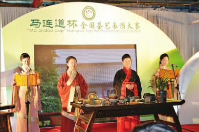 2013年全国茶艺大赛中,济南御青茶艺职业培训学校的教师进行“礼和天下 孔子茶道”茶艺表演。